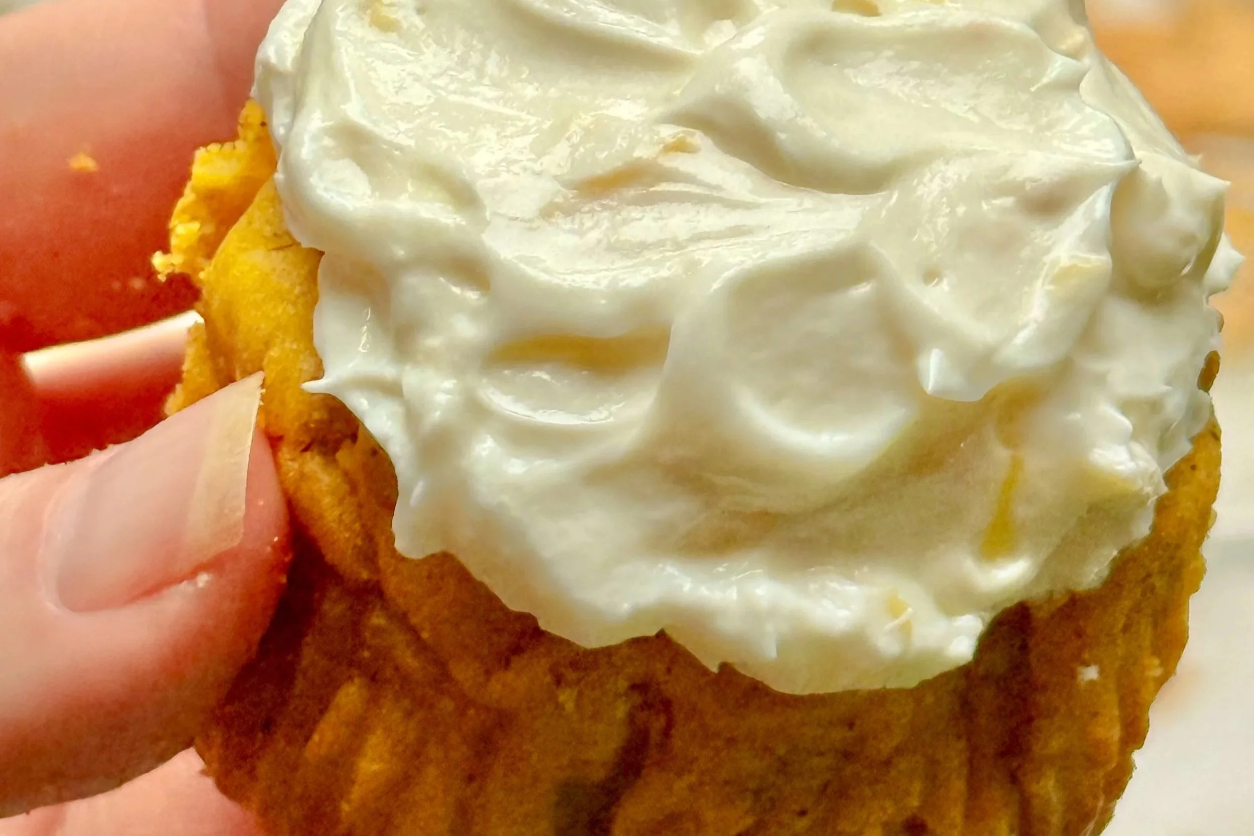 Saftige gresskarmuffins med sitronostkrem. En enkel oppskrift uten hvetemel – laget med rismel og fylt med varme krydder som kanel og ingefær.